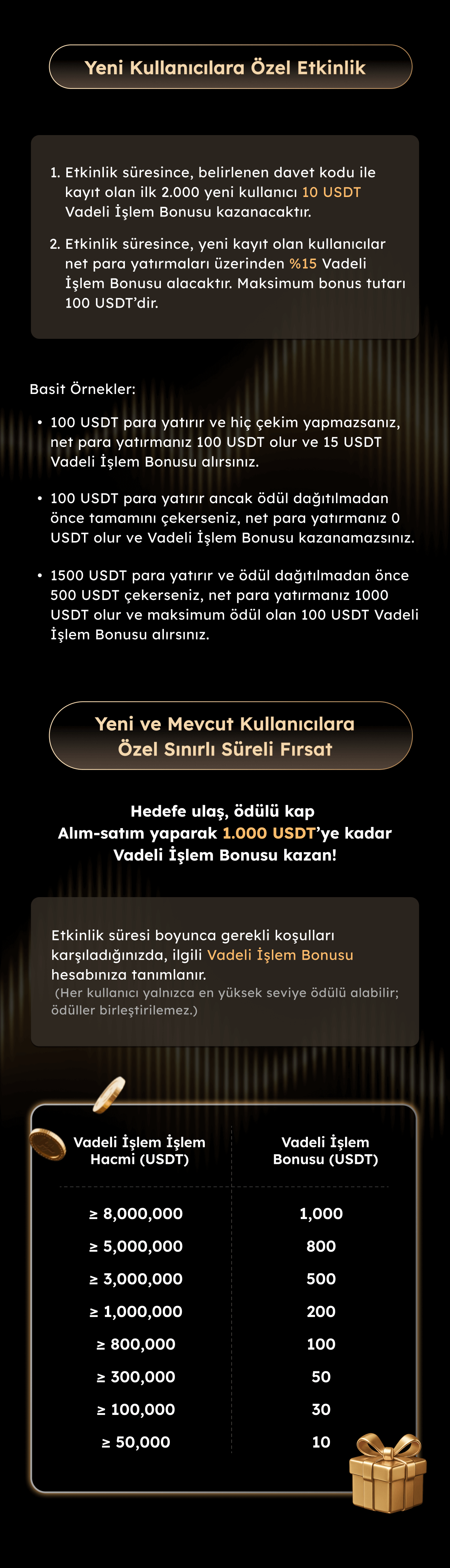 Yalnızca Taker işlem hacmi sayılır (bonus işlemleri ve 0 ücretli işlemler geçerli değildir).